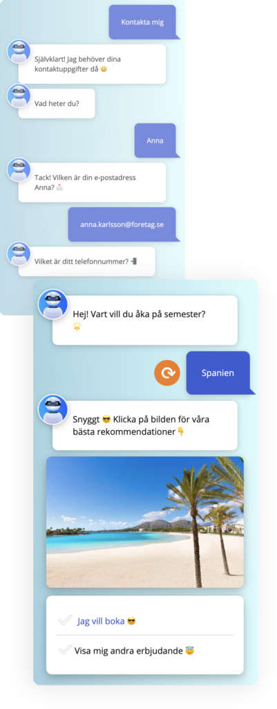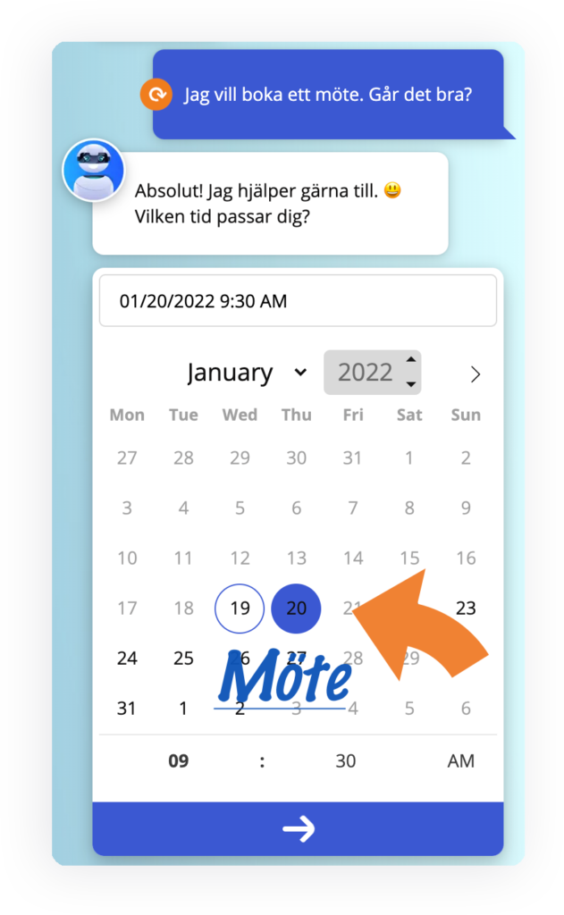 Chatbot kan hjälpa dig och ta hand om dina bokningar. Aktivera bokningssystemet i din chatbot för att schemalägga möten. Besökarna på din hemsida kan boka ett möte med dig eller någon från ditt företag med bara en klick. Kunderna kan enkelt boka tid för service, besök etc. Det finns inga begränsningar.