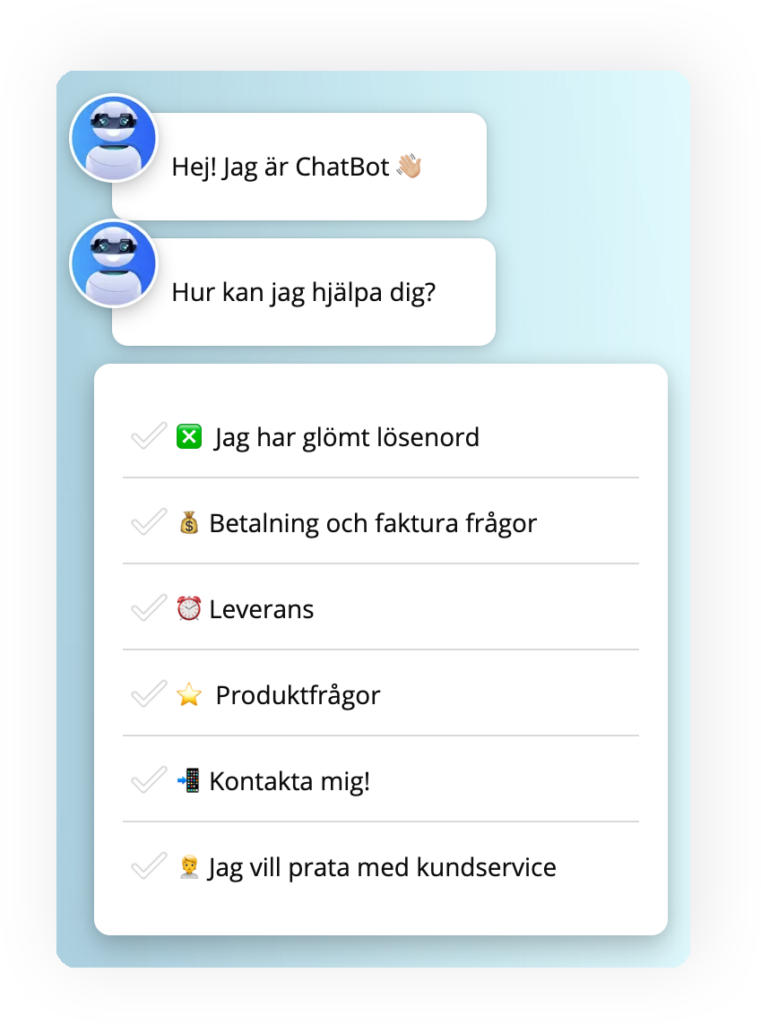Åtgärda kundens problem snabbare och smartare utan att behöva belasta dina medarbetare. Återkommande frågor äter upp tid och motivation. Låt chatboten göra jobbet så du inte behöver.